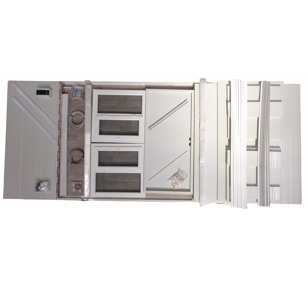 Tout ce qui est nécessaire pour l’assemblage de la cabine du conteneur est fourni dans le paquet. L’isolation thermique des murs avec le remplissage en polystyrène réduit la perte de chaleur.