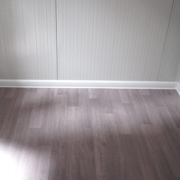– Sol : vinyle PVC effet bois recouvert de fibres de ciment, avec plinthes