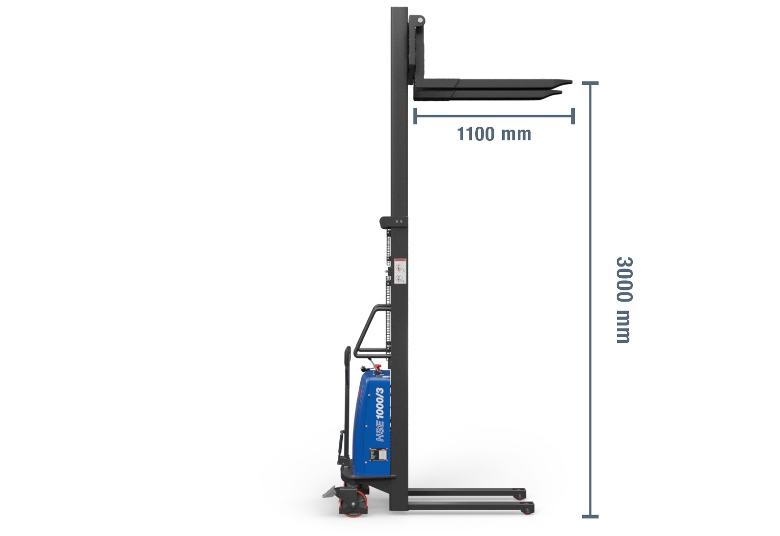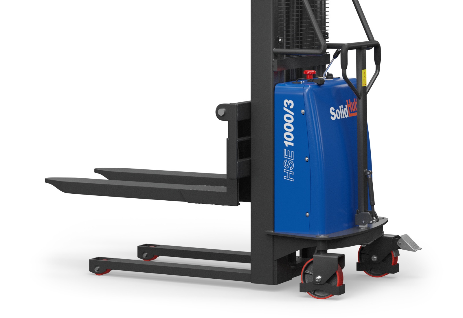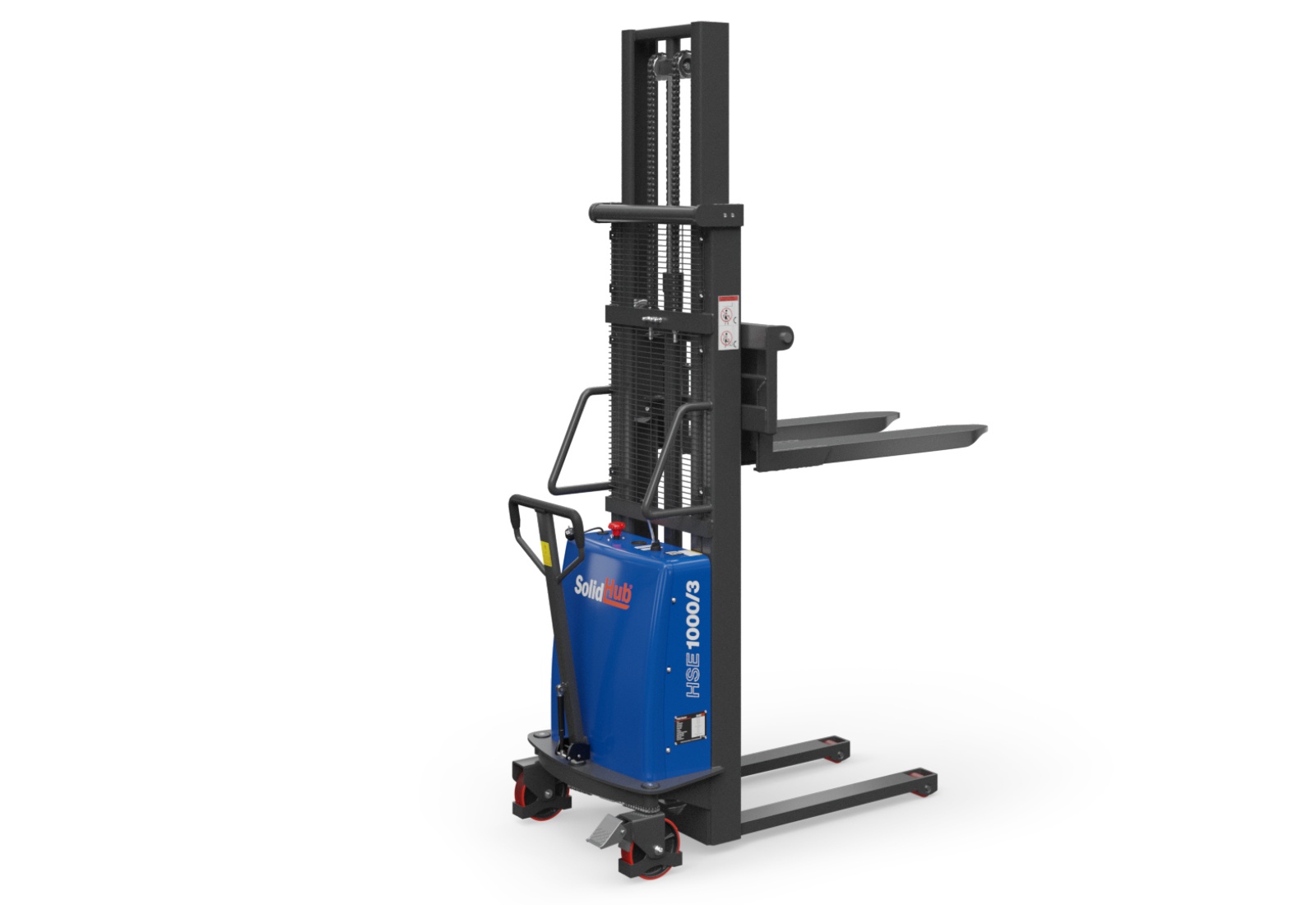Le gerbeur semi-électrique SolidHub HSE1000/3 est équipé d’un moteur de levage électrique, se déplace à la force musculaire et convient parfaitement aux petites entreprises pour empiler et désempiler des marchandises. L’appareil de transport très maniable est idéal pour débuter avec les engins de manutention motorisés.