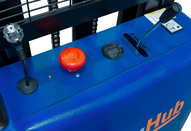 La batterie Plomb-acide ne nécessite aucun entretien et se recharge facilement sur n’importe quelle prise normale de 230 V à l’aide du chargeur interne. La batterie a une capacité de 120 Ah et une tension de 12 V. Le bouton rouge d’arrêt d’urgence sur la carrosserie du véhicule permet de couper le courant de l’appareil et d’arrêter immédiatement le moteur. Ce bouton permet d’allumer et d’éteindre le véhicule. Lorsque la batterie est entièrement chargée, vous pouvez travailler avec le gerbeur semi-électrique pendant environ 4 h d’affilée. Lorsque la batterie est complètement vide, le processus de charge dure environ 6 h.