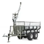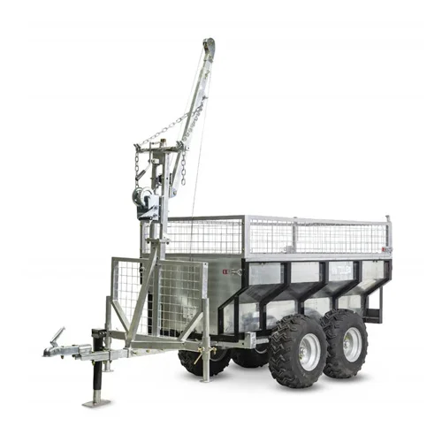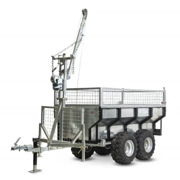 La remorque à double essieu avec benne galvanisée et grue intégrée est conçue pour le transport et la manutention du bois, offrant une solution polyvalente pour les travaux forestiers et les tâches de jardinage. Voici une description détaillée des caractéristiques et des fonctionnalités de cet équipement robuste :