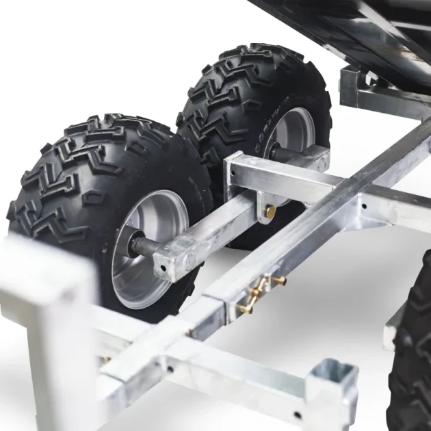 Double Essieu Articulé : Fournit une excellente stabilité et adhérence sur terrains accidentés ou détrempés grâce à ses deux grandes roues pneumatiques profilées de 22 x 11-18.