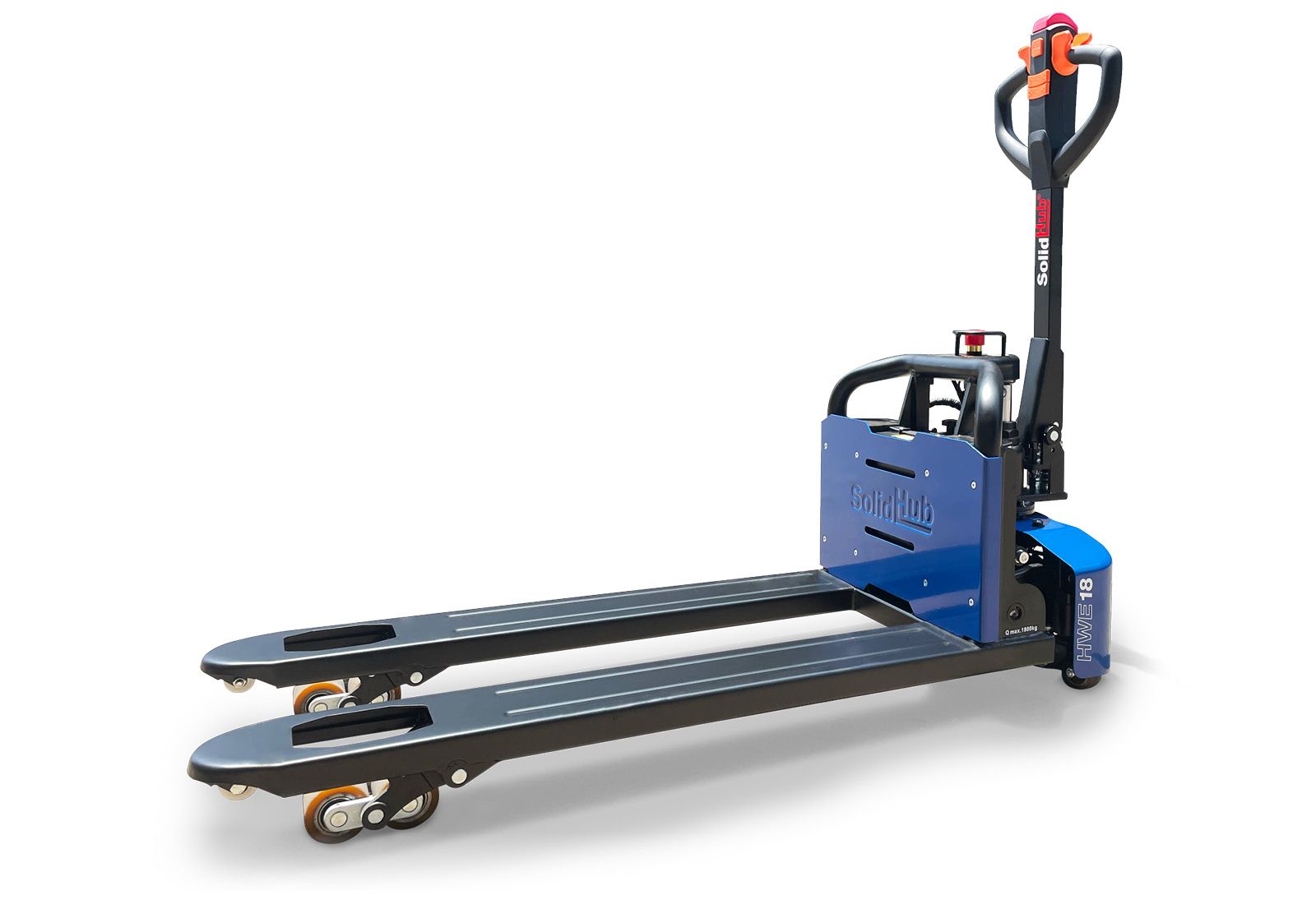 Jusqu’à un poids de charge de 1.800 kg, le transpalette électrique de la marque SolidHub soulève et transporte aisément les marchandises en stock et les produits finis.